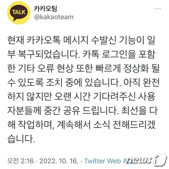 내 카톡 왜 이래 오전 1시간 20분간 먹통 현재 복구 완료 뉴스 동아일보
